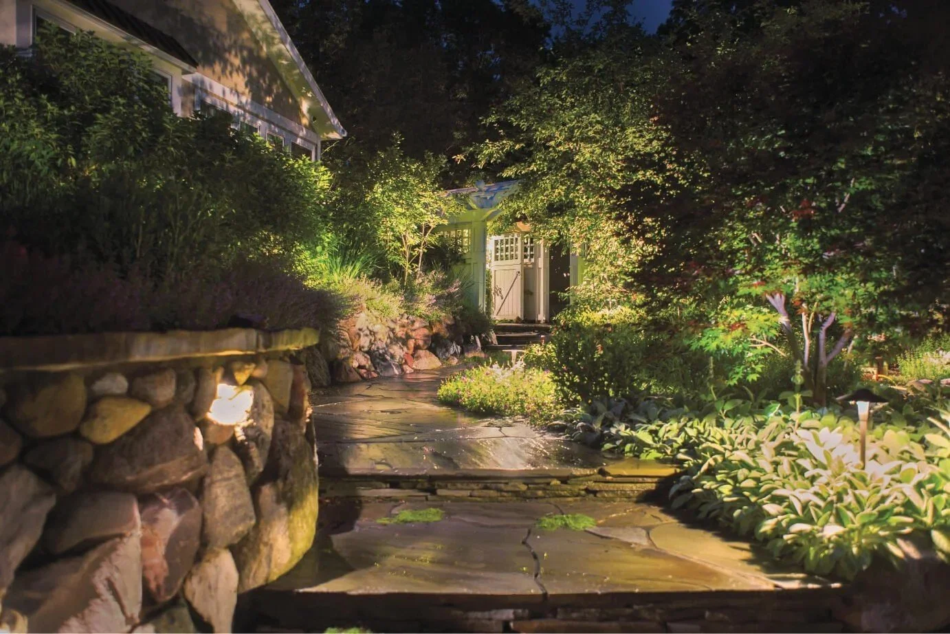 Patios, paths, walkways, and general landscape lighting creates an ambiance that pulls everything together in the evening. Outdoor lighting allows the beautiful landscape design to shine even at night.